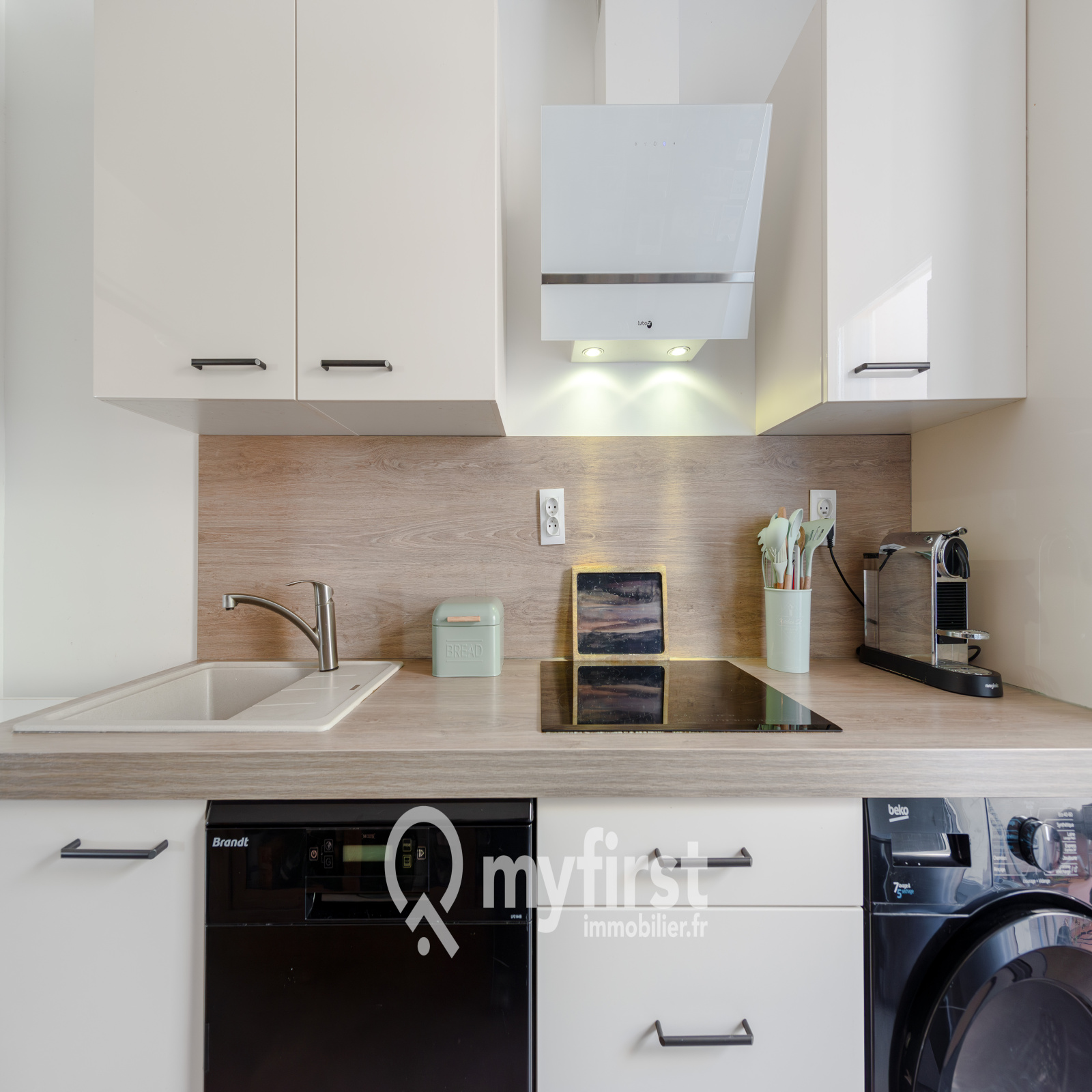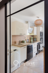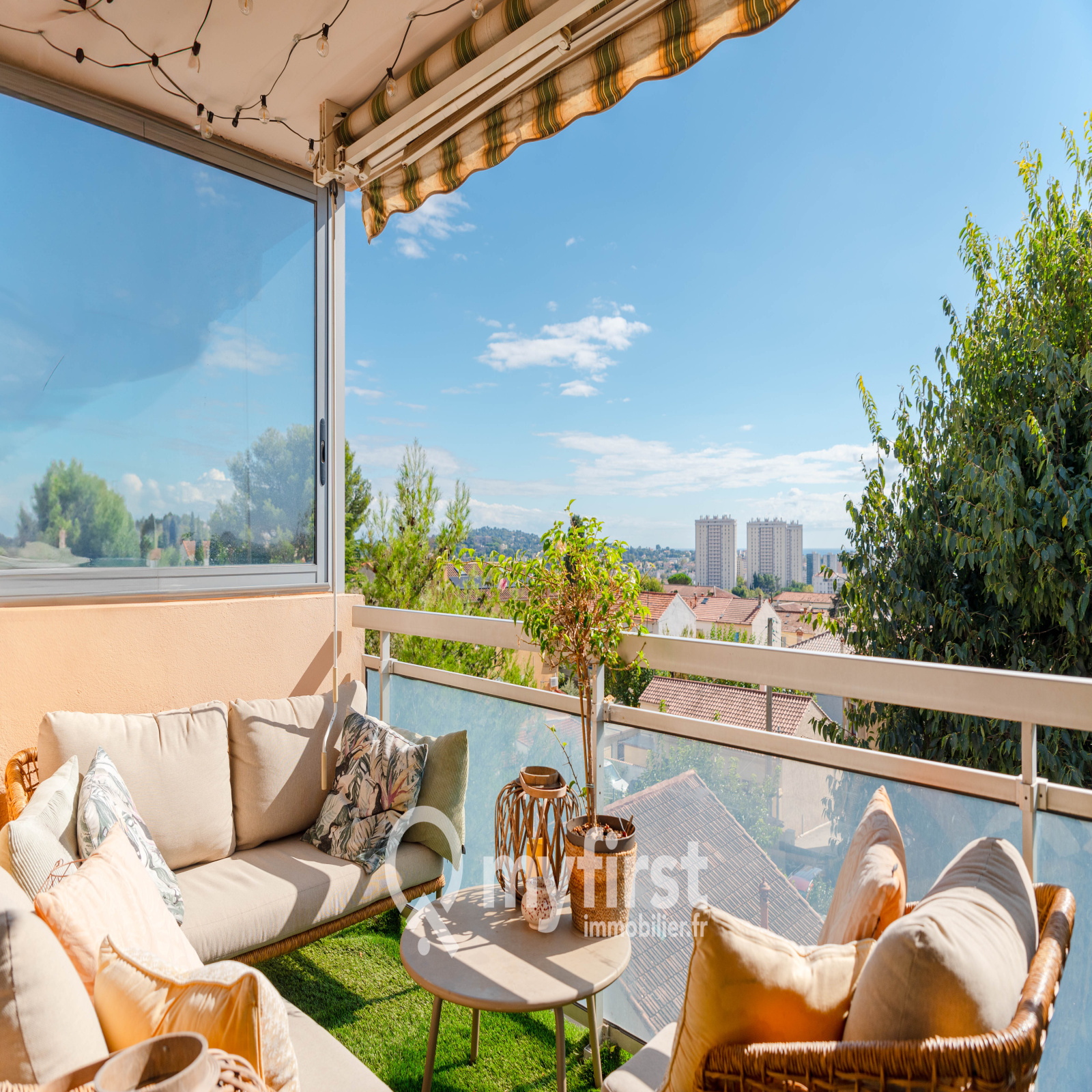 La cuisine, séparée par une élégante verrière, est entièrement équipée et s'ouvre sur un balcon où le regard se perd sur les collines du Mont Faron. Un coin de tranquillité idéal pour prendre un café le matin, ou s’offrir tout simplement un espace de rangement supplémentaire.