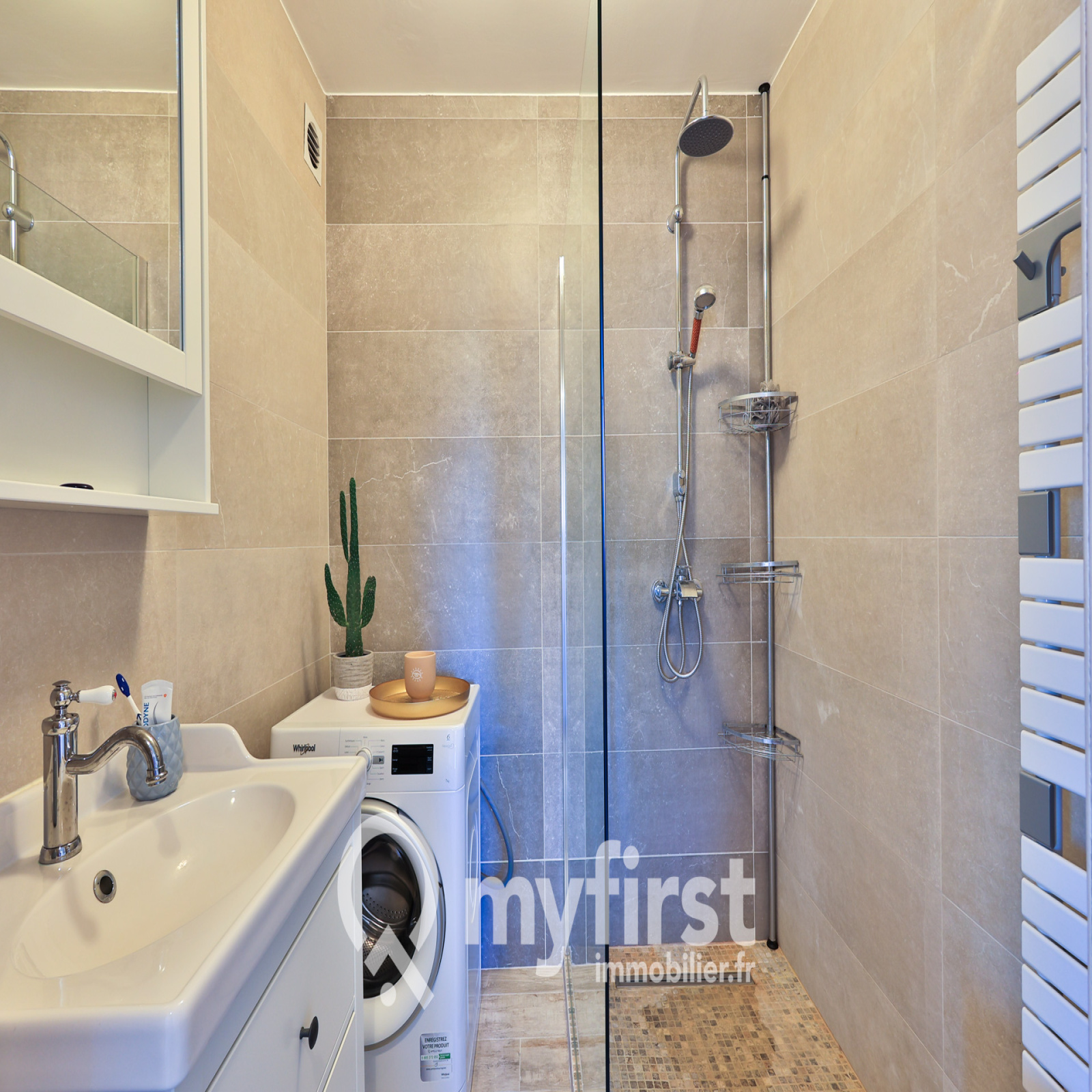 La salle d’eau, située en face de la chambre, est confortable, suffisamment pour y accueillir un superbe meuble vasque, une douche pour deux personnes, un emplacement pour votre machine, et un sèche serviette électrique. Le W.C. quant à lui, est indépendant.