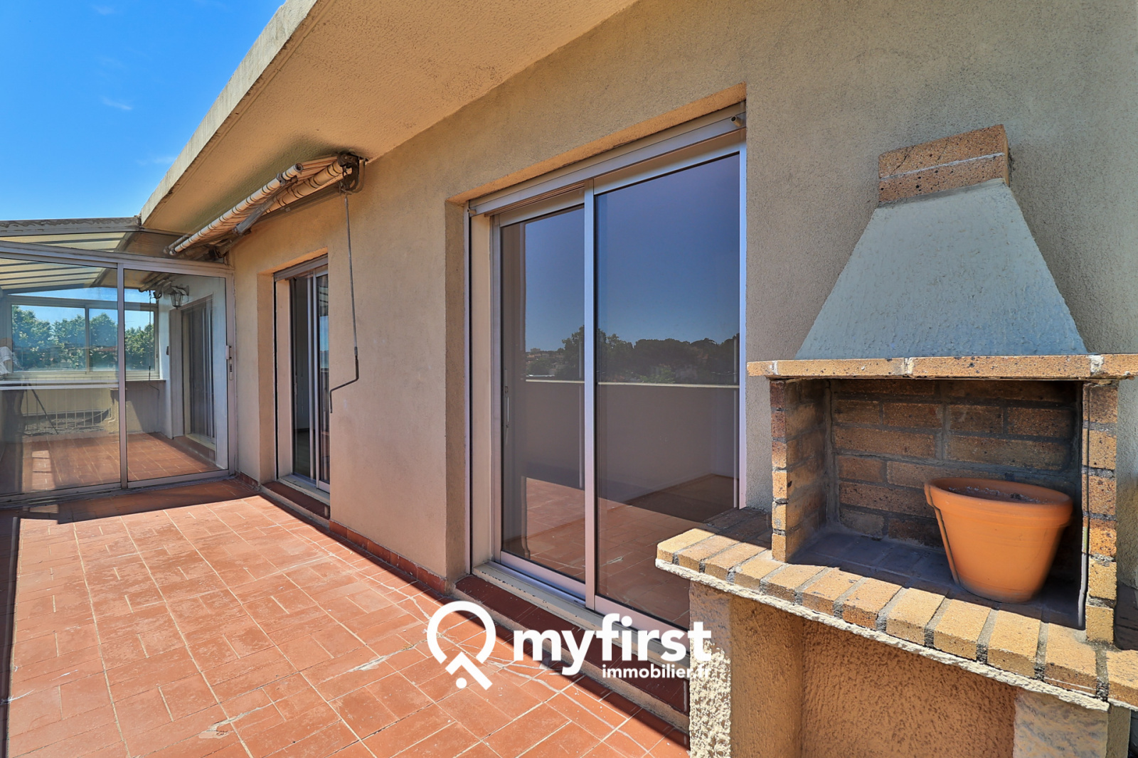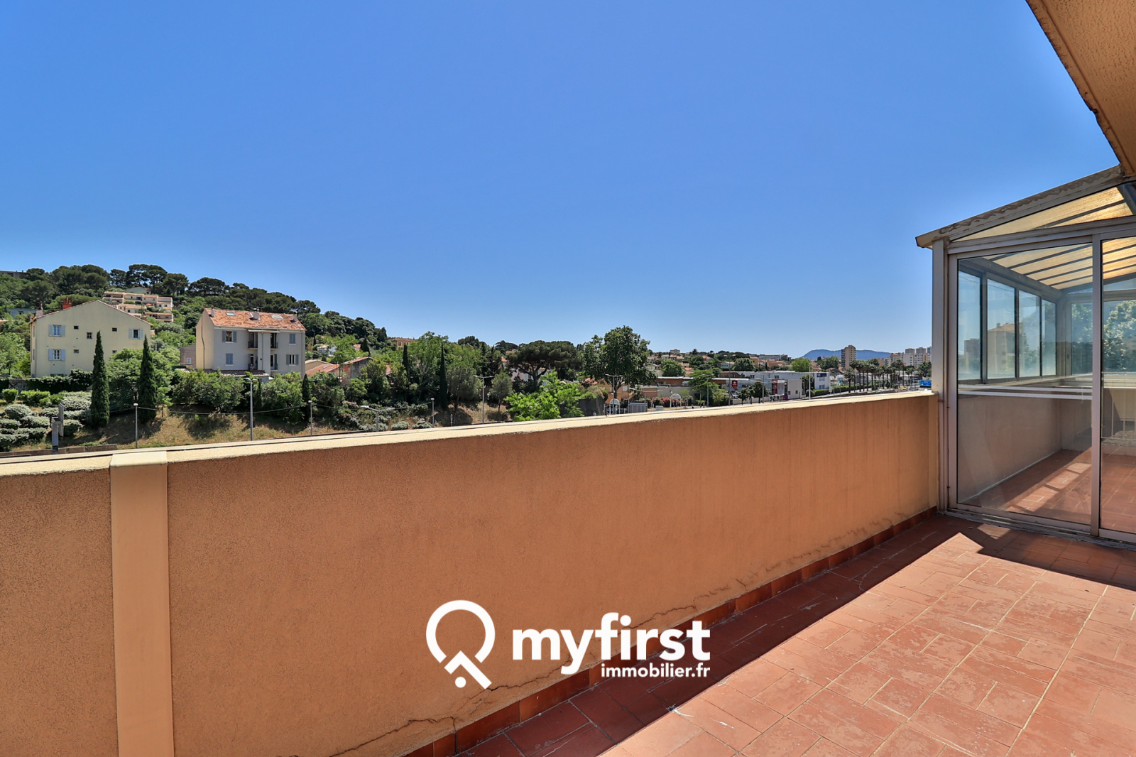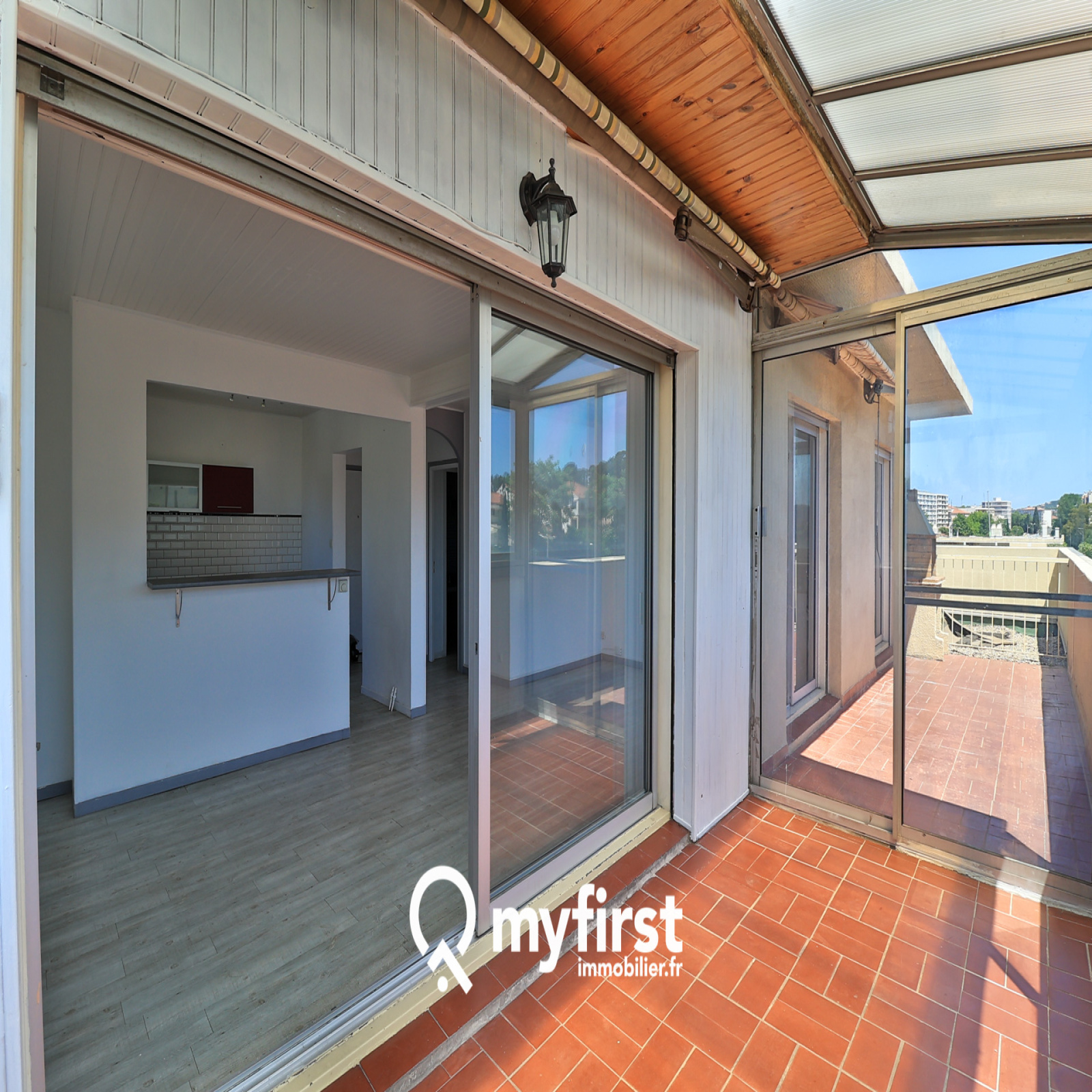 Justement… L’atout majeur de cet appartement est sa large terrasse, divisée en deux parties, un coin véranda faisant office de jardin d’hiver, et un autre espace, entièrement ouvert sur l’extérieur avec un magnifique panorama.