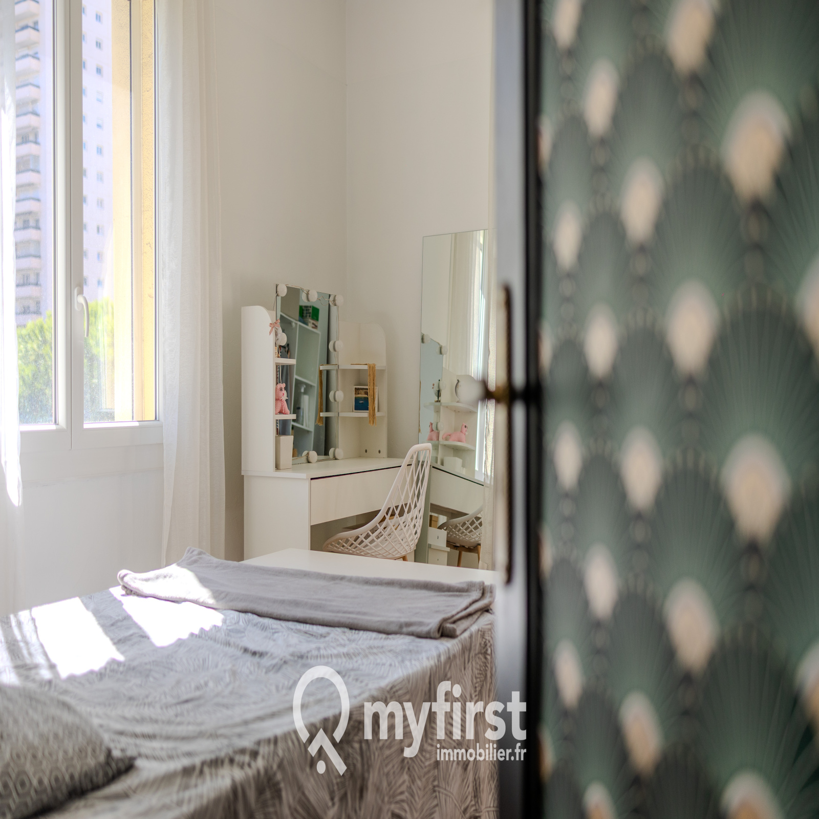 Côté nuit, l’appartement propose trois véritables chambres (avec possibilité d’en créer une quatrième), toutes climatisées, et profite d’une belle hauteur sous plafond typique des immeubles des années 50.