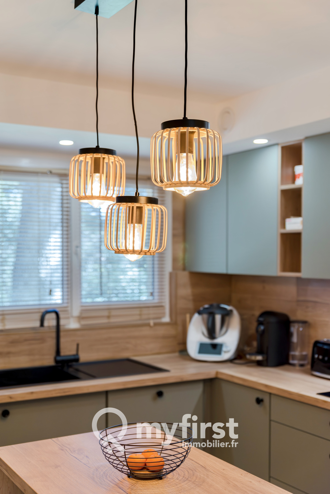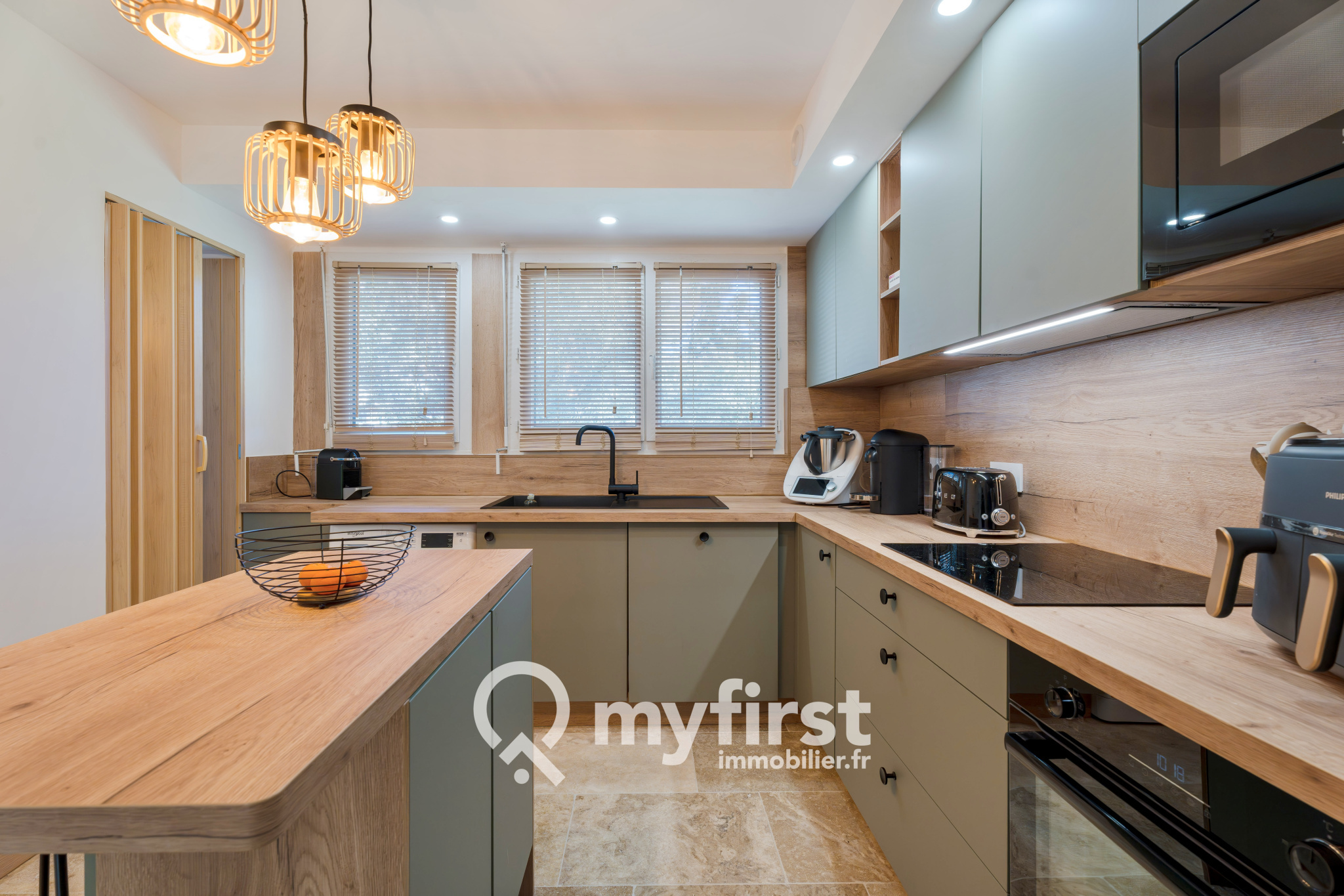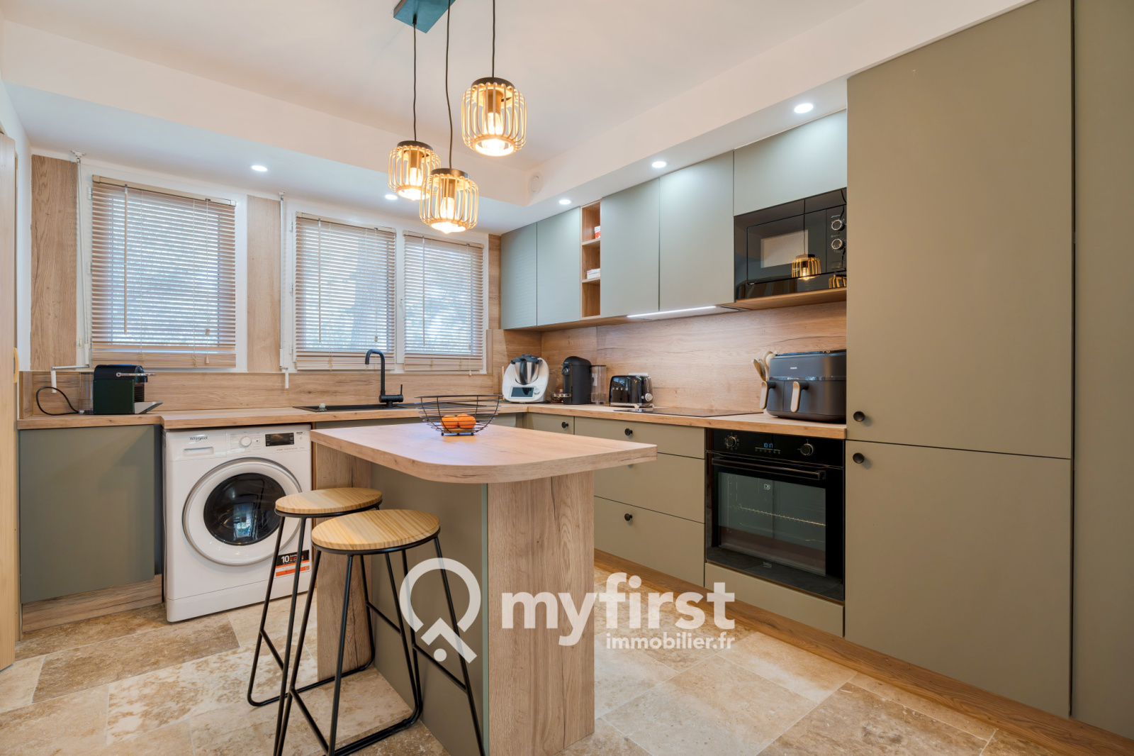 La cuisine, entièrement équipée et signée Xina, s’organise autour d’un îlot central convivial. Four, micro-ondes, lave-vaisselle, rangements généreux… tout est en place. Dans son prolongement, une pièce attenante fait office de buanderie et d’espace de stockage, un confort toujours appréciable au quotidien.