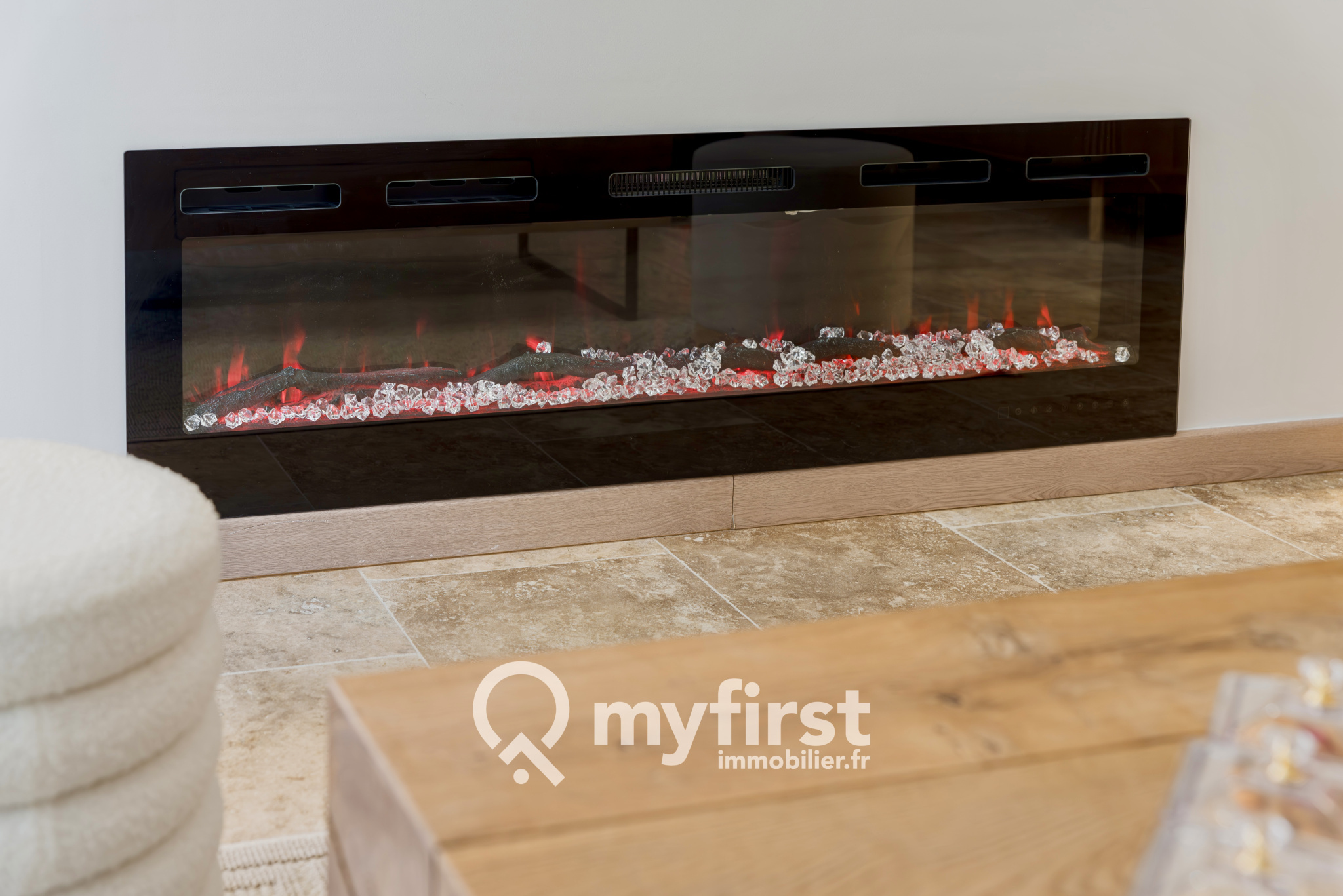 L’appartement, idéalement situé dans l’immeuble le plus en retrait de la résidence, bénéficie d’un calme particulièrement appréciable. Installé en rez-de-chaussée, il s’ouvre sur une pièce de vie élégante et chaleureuse où chaque détail a été soigneusement travaillé. Le sol en véritable travertin apporte immédiatement du caractère et une sensation de noblesse discrète.