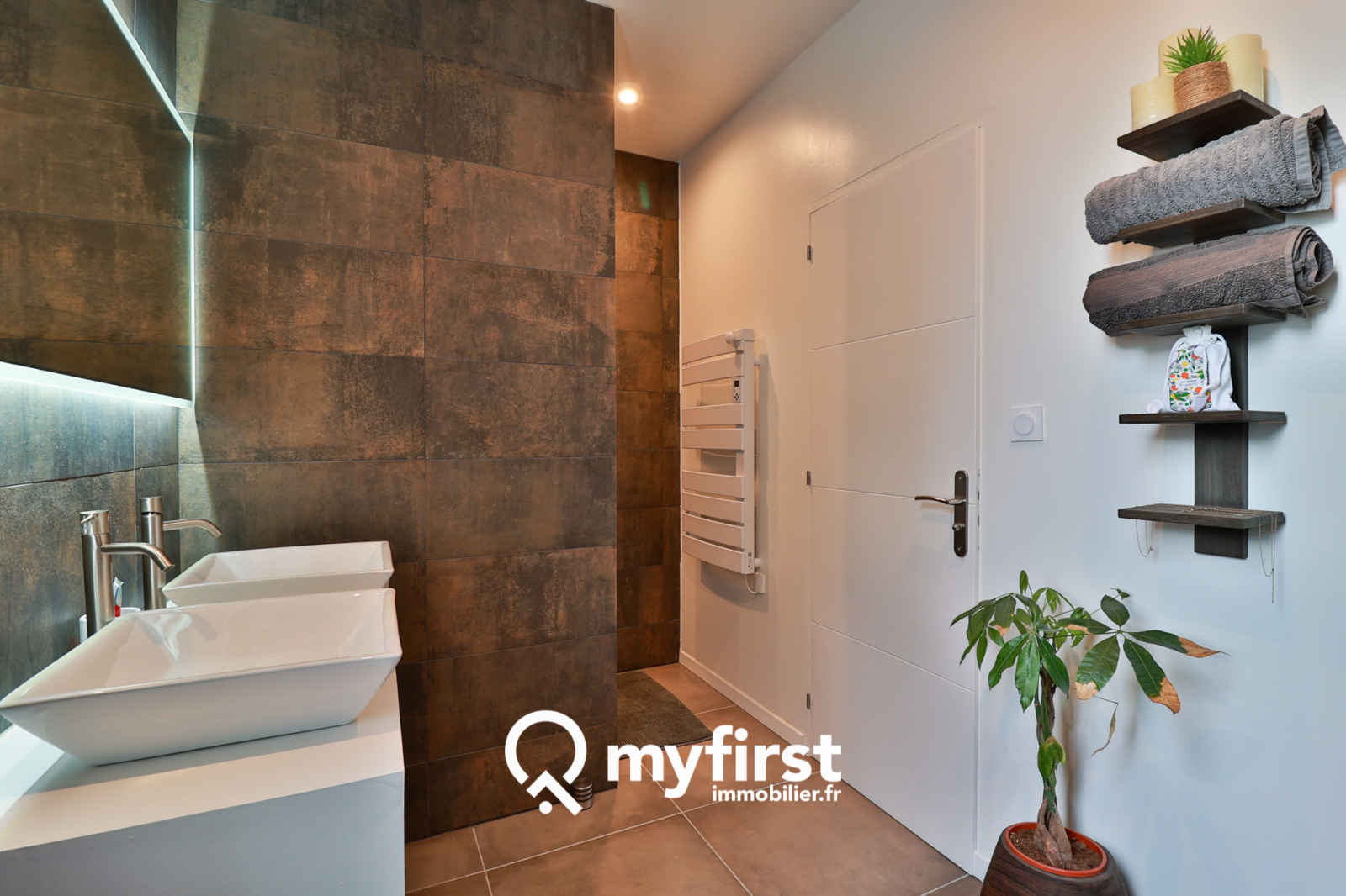 La salle d’eau quant à elle, est pensée dans un style industriel, tout en ayant des tons de couleurs chaleureux et attrayants. Vous profiterez d’une double vasque pour un confort au quotidien, d’une immense douche type « italienne », d’un sèche serviette et d’un miroir retro éclairé ainsi que d’une belle ouverture.