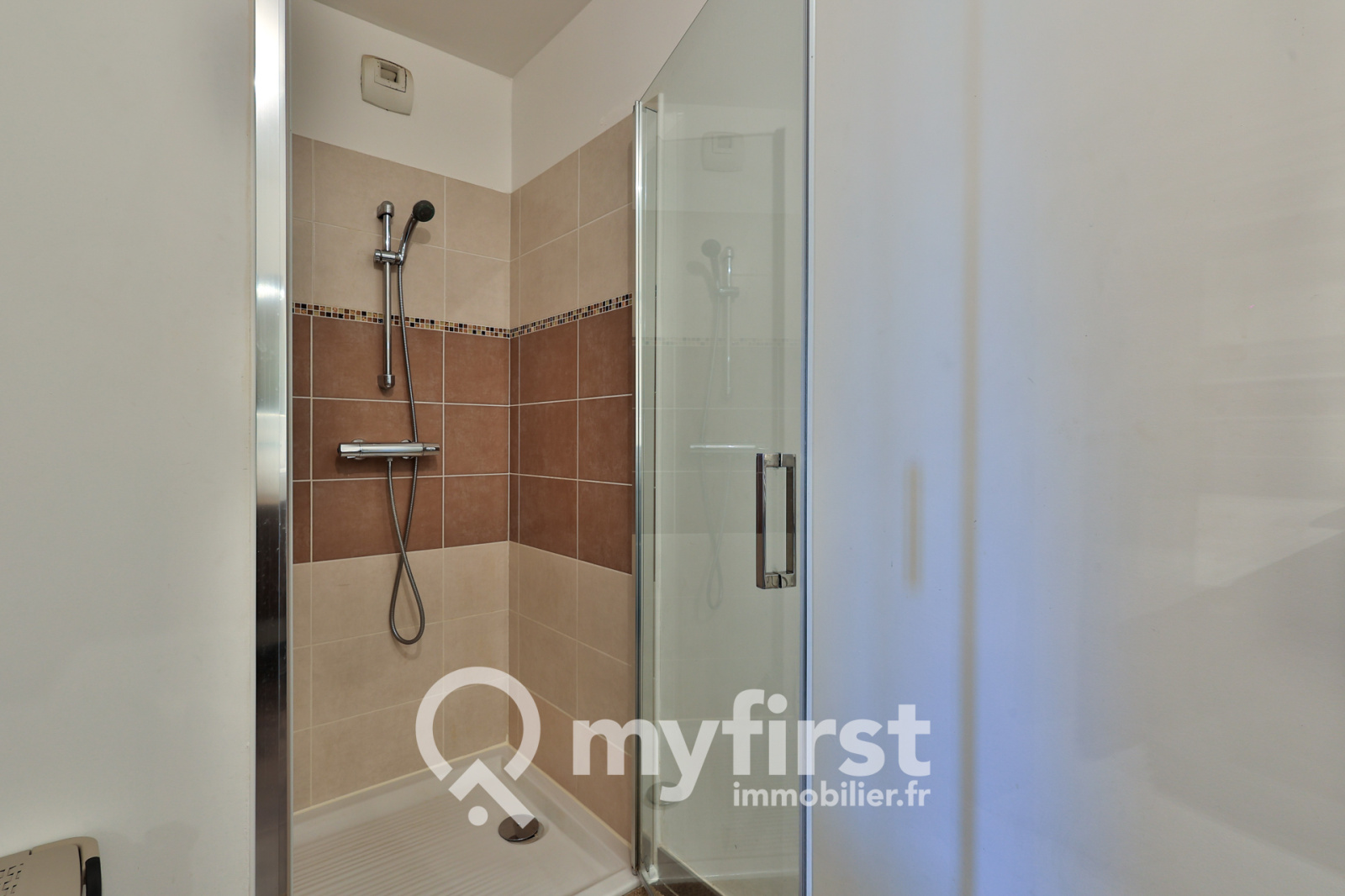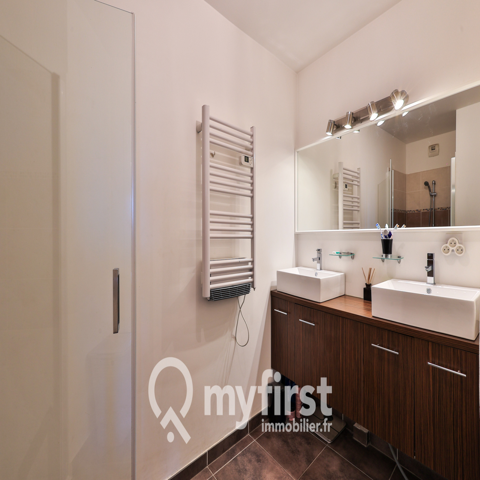 Ensuite une grande salle d’eau, profitant d’un meuble double-vasque et d’un coin « buanderie », sans oublier la superbe douche entièrement carrelée.