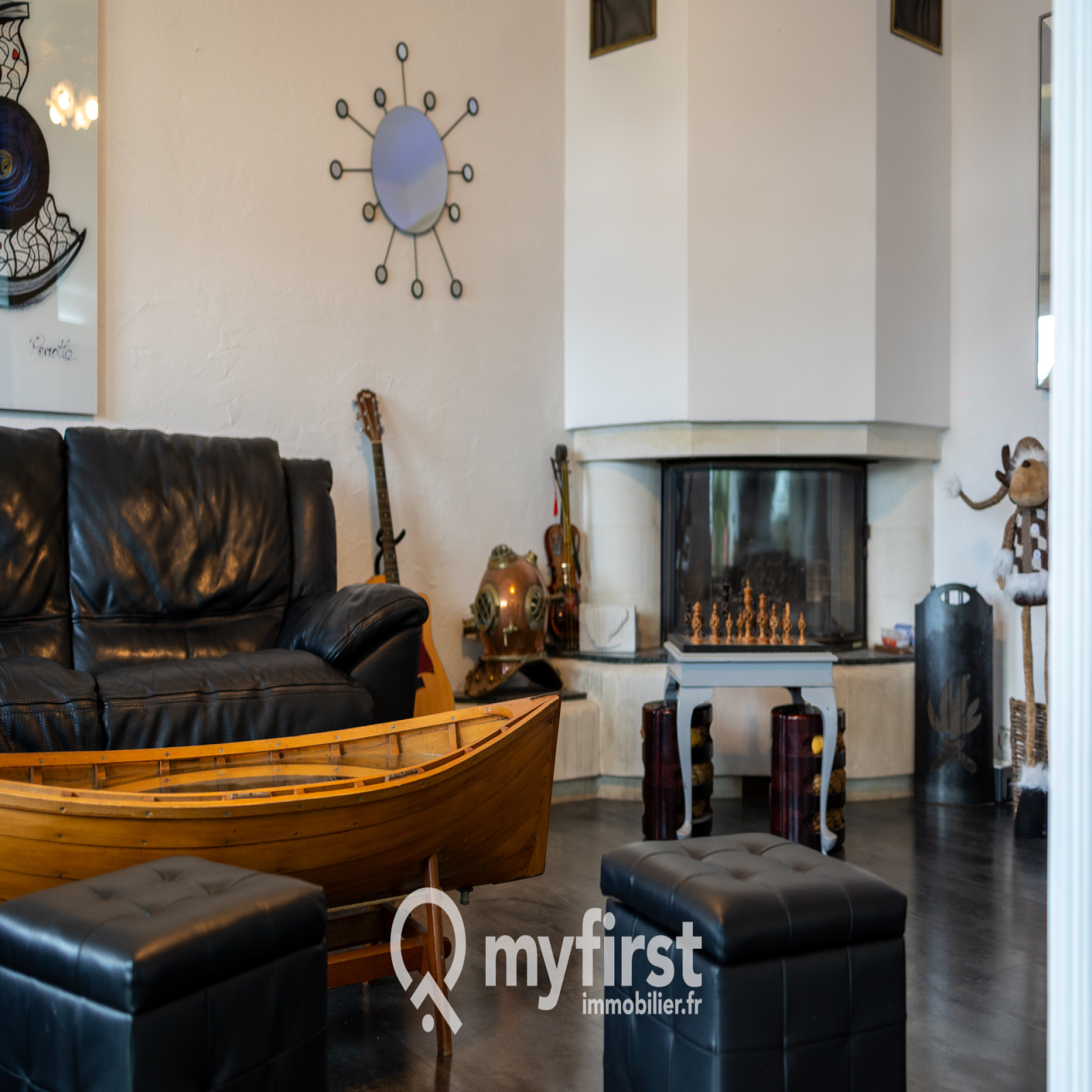 Arrivé dans le hall, vous ressentirez immédiatement l'atmosphère chaleureuse se dégageant de cette demeure, vous ne pourrez que contempler l'immense pièce de vie et ses multiples ouvertures sur la Mer. Le salon profite d'une cheminée à insert, la promesse de soirées chaleureuses en hiver.