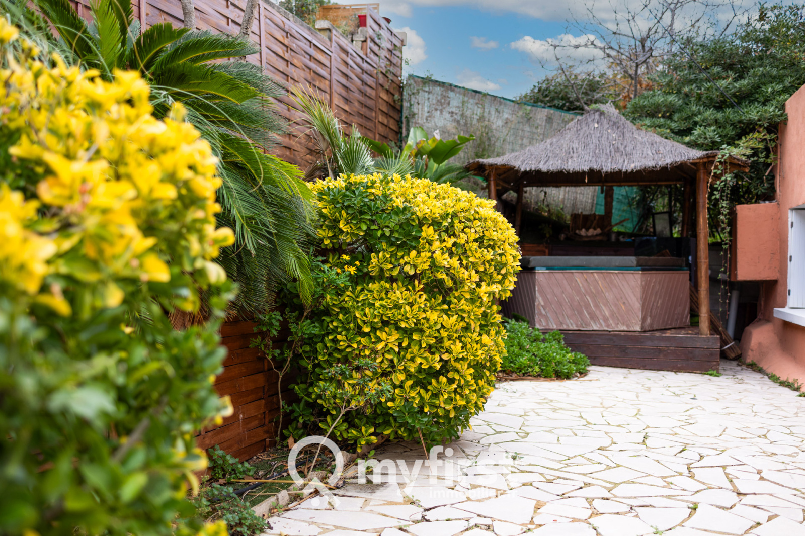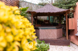 Une terrasse est située à l'arrière de la maison, un coin plus ombragé, permettant de se rafraîchir l'été, ou justement de se réchauffer l'hiver grâce à son emblématique coin jacuzzi rappelant les constructions Balinaises.