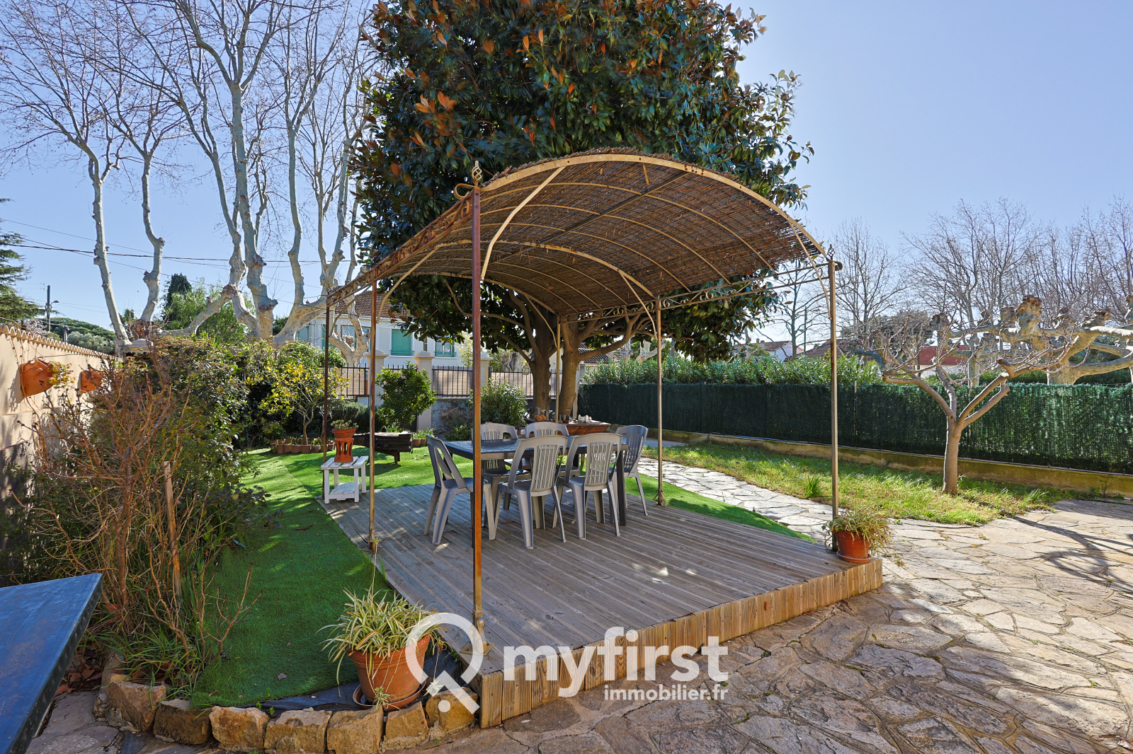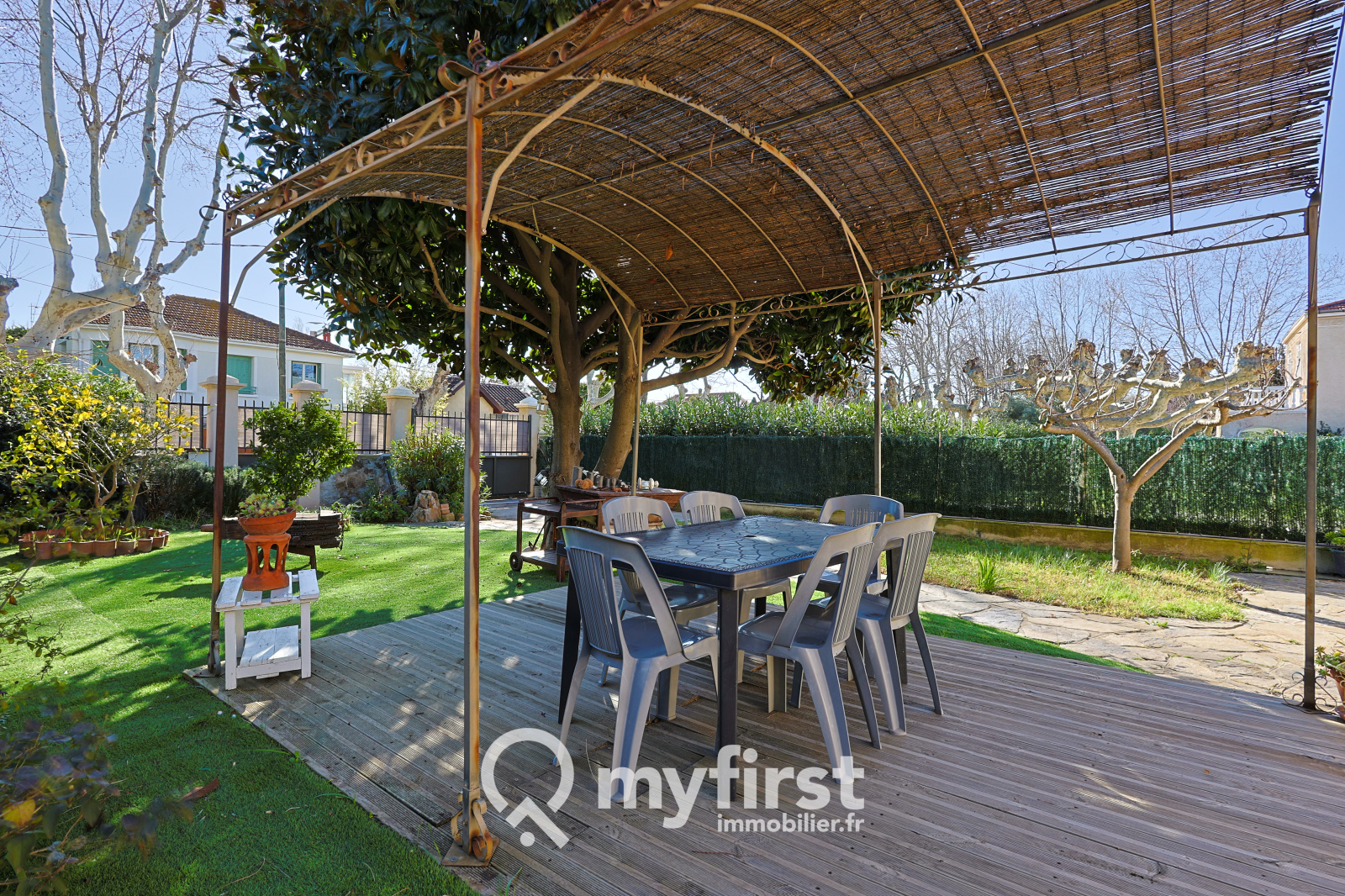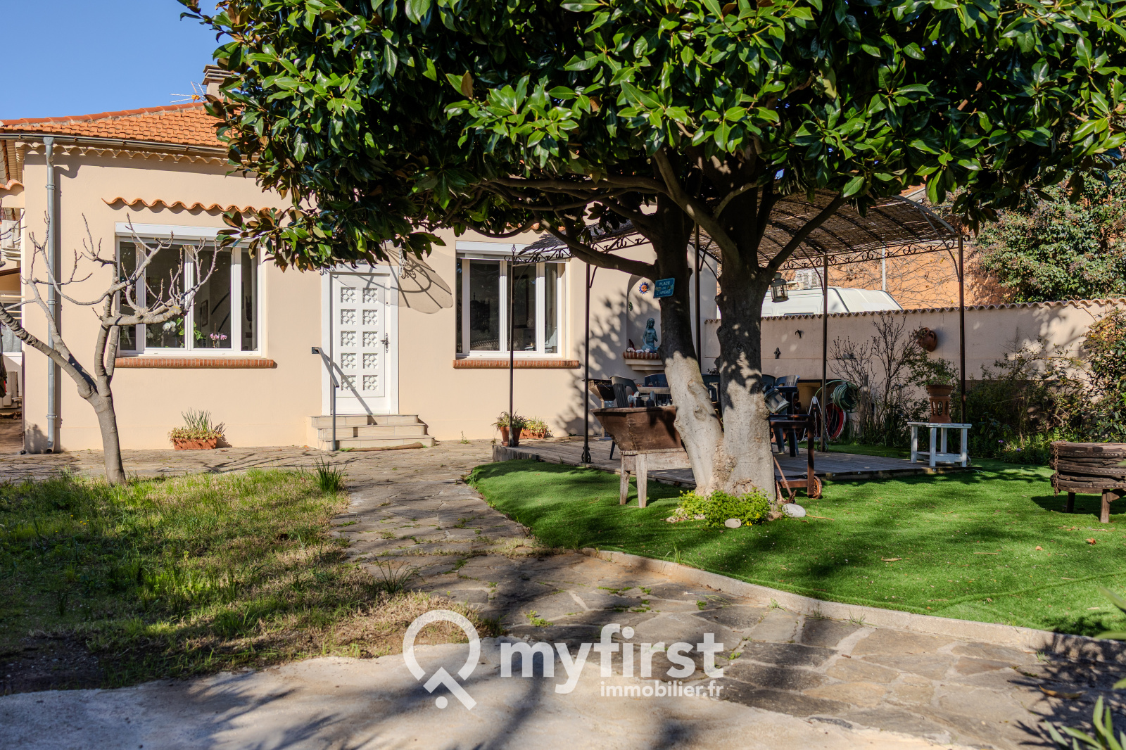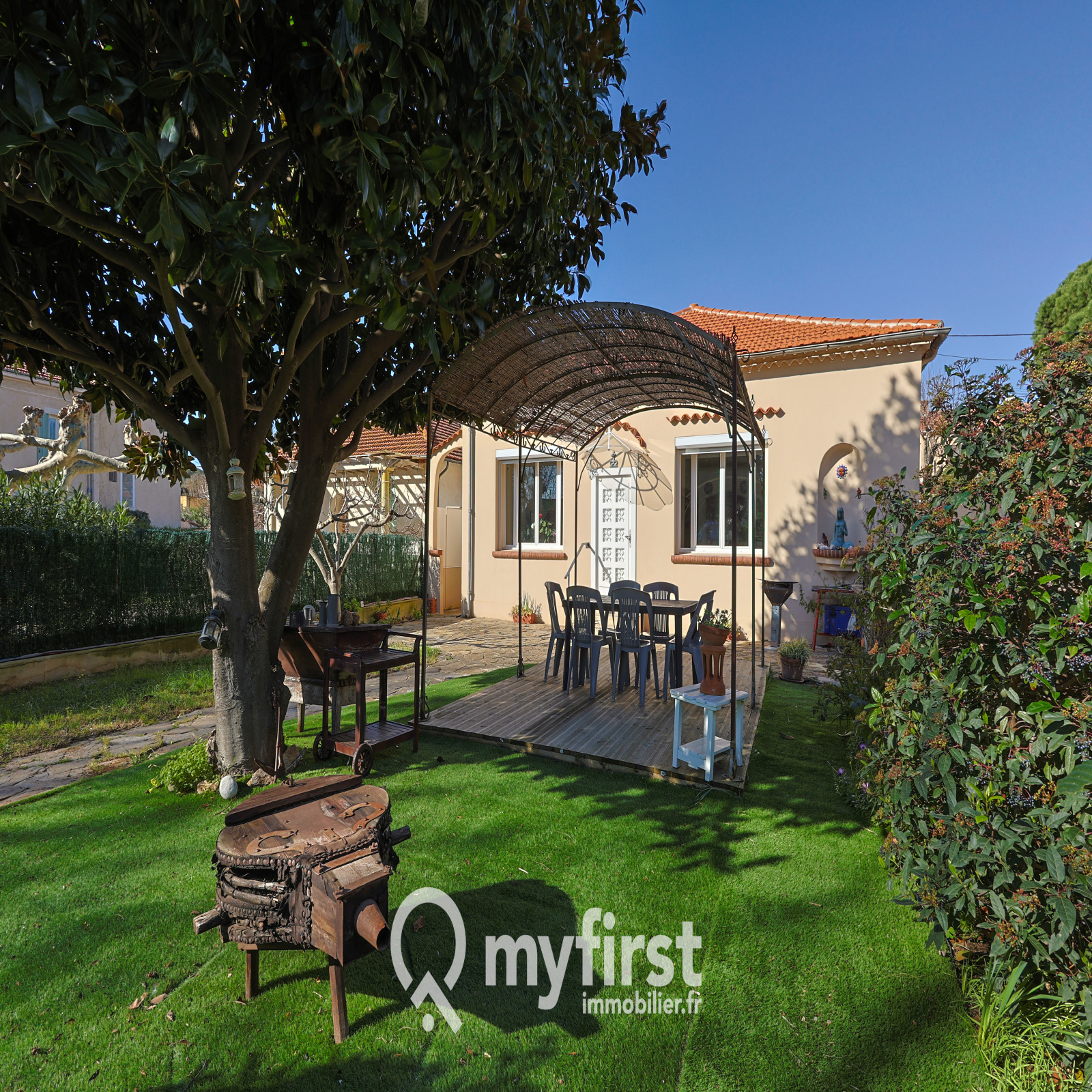 À l’extérieur, le jardin a tout du petit écrin méditerranéen. Une terrasse idéale pour les repas d’été, un coin verdoyant où poussent thym et romarin, et un majestueux arbre qui offre une ombre bienvenue lors des journées ensoleillées. Trois véhicules peuvent se stationner sur le terrain, et le garage isolé de 14 m², trop juste pour une voiture, pourra sans problème accueillir une moto ou devenir un espace de bricolage fonctionnel.