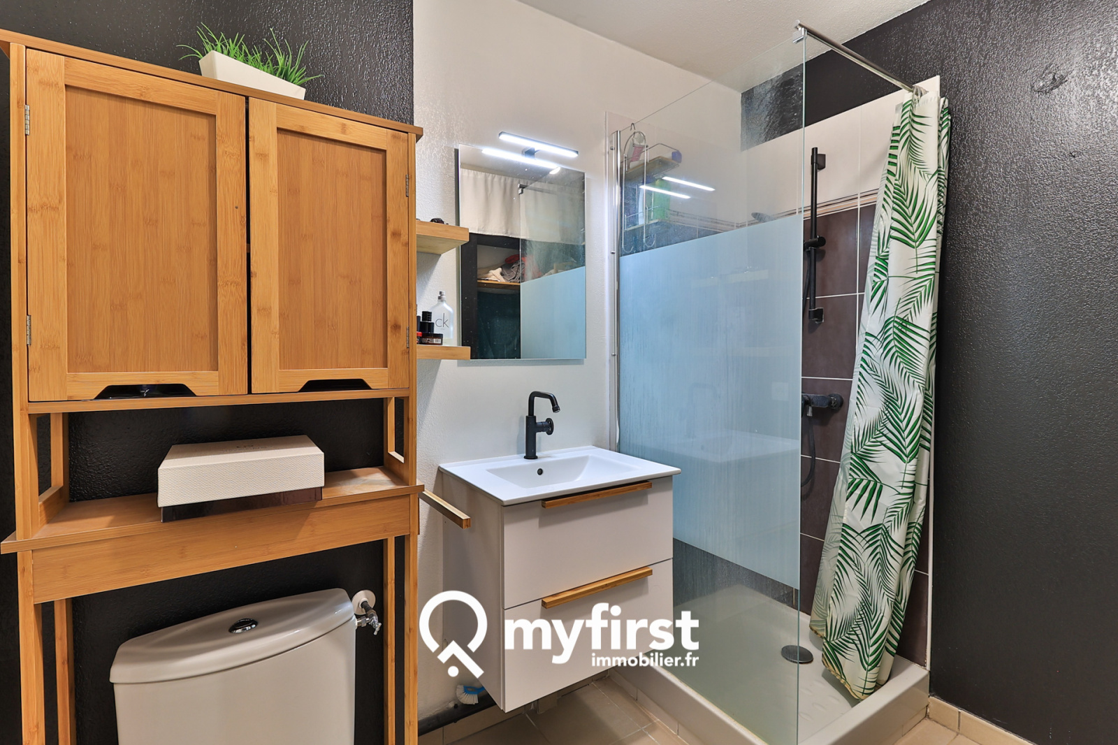 La salle d'eau est équipée d'un sèche serviette, d'une cabine de douche et d'un meuble vasque. De nombreux rangements l'agrémente.