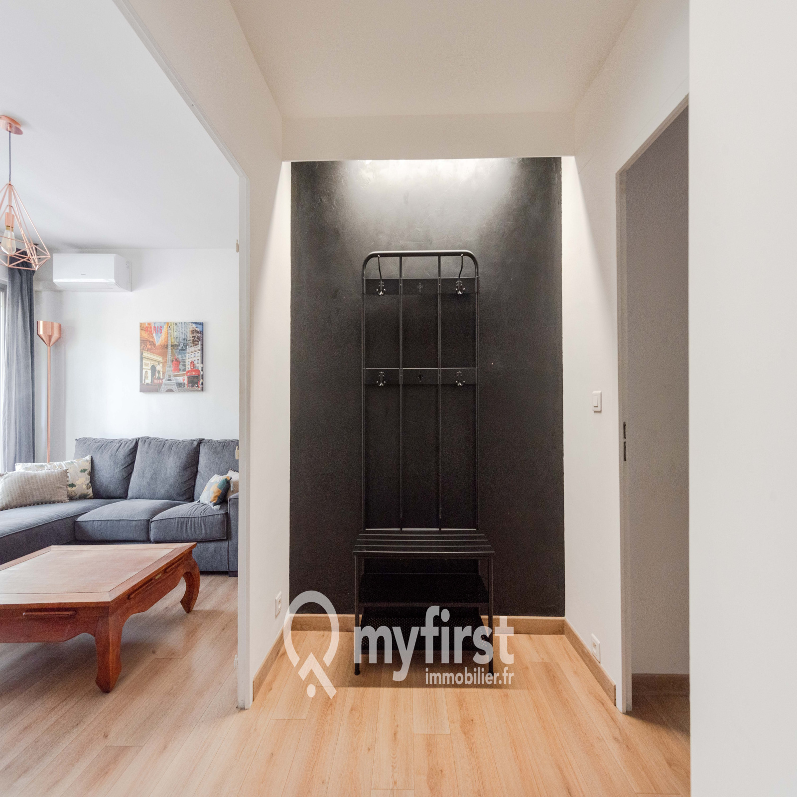 Revenons à l’appartement : Une fois la porte d’entrée franchie, vous ferez face à un grand hall d’entrée desservant toutes les pièces de l’habitation et offrant un bel espace de rangement.