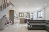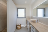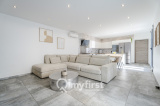 Le premier appartement, en rez-de-jardin, développe environ 85 m². Dès l’entrée, la lumière s’impose comme fil conducteur. Le carrelage au sol dialogue avec une cuisine américaine parfaitement intégrée à une vaste pièce de vie, chaleureuse et ouverte. Trois chambres viennent compléter l’ensemble, accompagnées d’une salle d’eau élégante et fonctionnelle. À l’extérieur, une large terrasse carrelée prolonge naturellement l’espace de vie. Autour, les oliviers dessinent un décor méditerranéen apaisant. Et puis, il y a la piscine. Une piscine traditionnelle, entièrement carrelée en pierre de Bali, aux reflets profonds et raffinés. Aucun vis-à-vis, une exposition plein sud, un ensoleillement optimal. Ici, le temps ralentit.